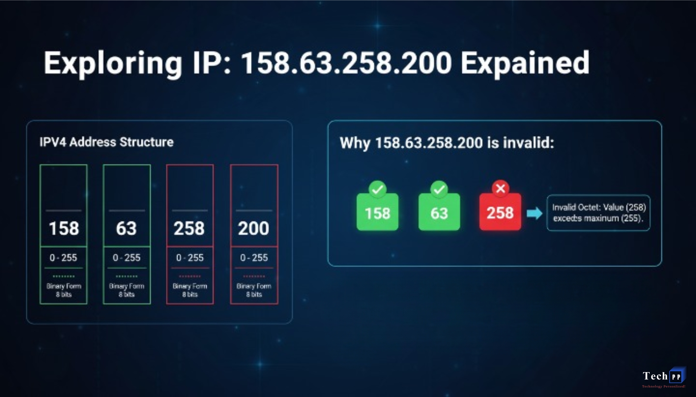 The address 158.63.258.200 appears to be a valid IPv4 address at first glance, but there are reasons as to why it does not work. “258” is an octet in “258” is an invalid octet because it exceeds the 8-bit numerical limit of an IP address.