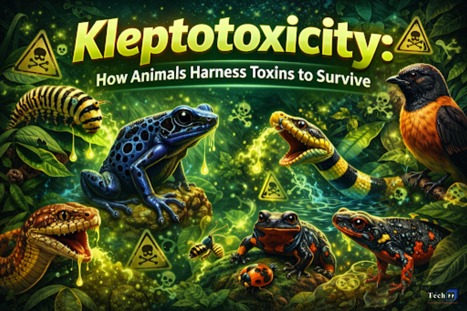 - Poison Dart Frogs – An example of poison dart frogs and kleptotoxicity is that some of the species do not create their own toxins and do not have any skin to protect them. Instead, they eat ants and other bugs that have poison alkaloids and use those frogs to protect their skin.